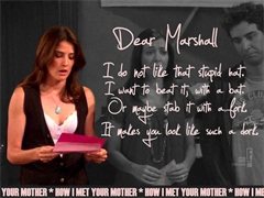 マーシャルのダッドの最後の言葉の話。 重たすぎることになることなく、シットコムらしい話。 でも、こういう話いる?って気もしないでもない。